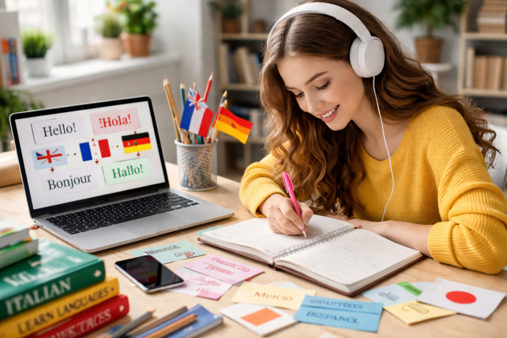 - Filme und Serien: Schau Filme und Serien in der Zielsprache. Beginne mit Untertiteln in deiner Muttersprache, wechsle dann zu Untertiteln in der Zielsprache und später ohne. Achte auf die Intonation, Aussprache und umgangssprachliche Ausdrücke.